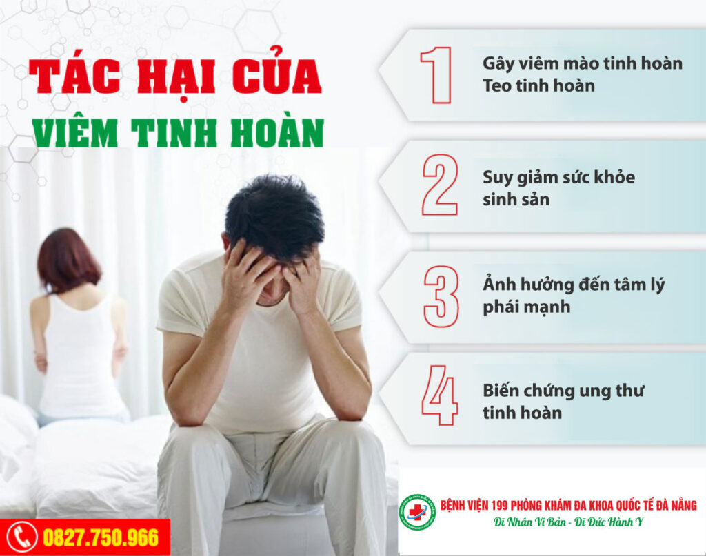 Viêm tinh hoàn có thể gây chết tinh, vô tinh, suy giảm chức năng sinh sản, và lây nhiễm vi khuẩn sang cho bạn tình, trực tiếp khiến bạn tình mắc bệnh phụ khoa, gây tổn hại lớn tới sức khỏe của đối phương.